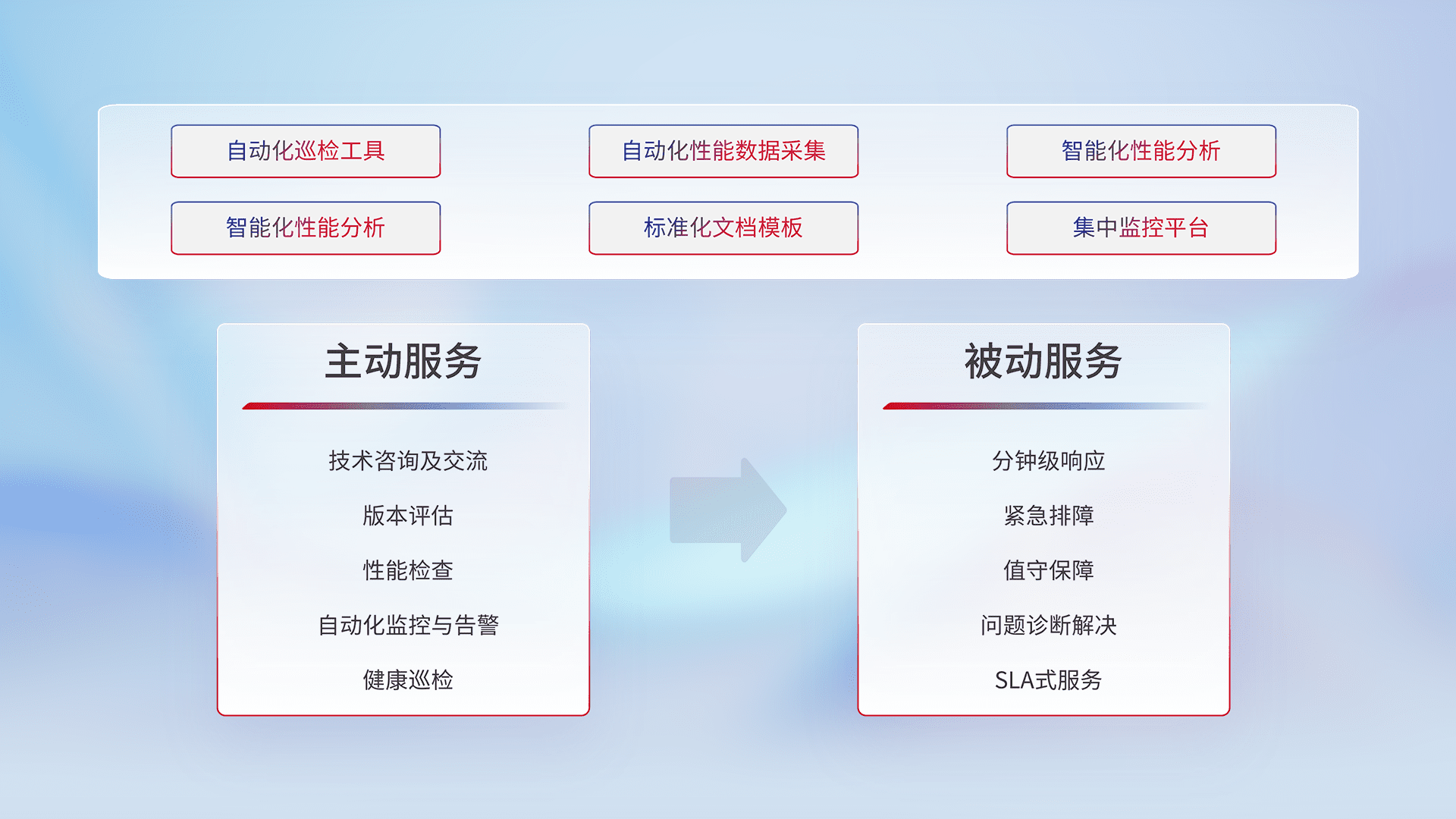 智能化工具和标准化文档,,,保障服务质量,,提供主动服务(包含技术咨询、、、、版本评估、、性能检查、、自动化监控与告警、、健康巡检)和被动服务包含(分钟级响应、、、紧急排障、、、值守保障、、、问题诊断解决、、SLA服务)。。。。